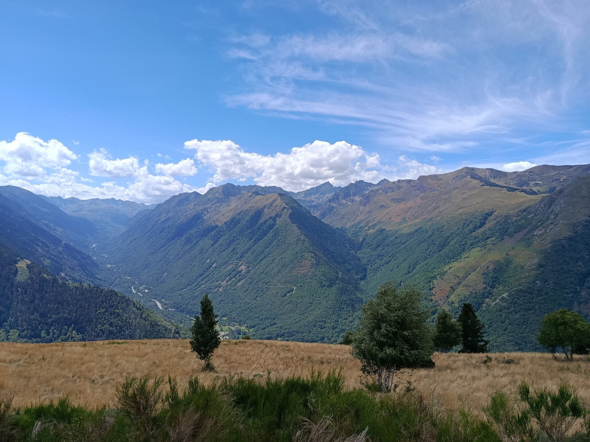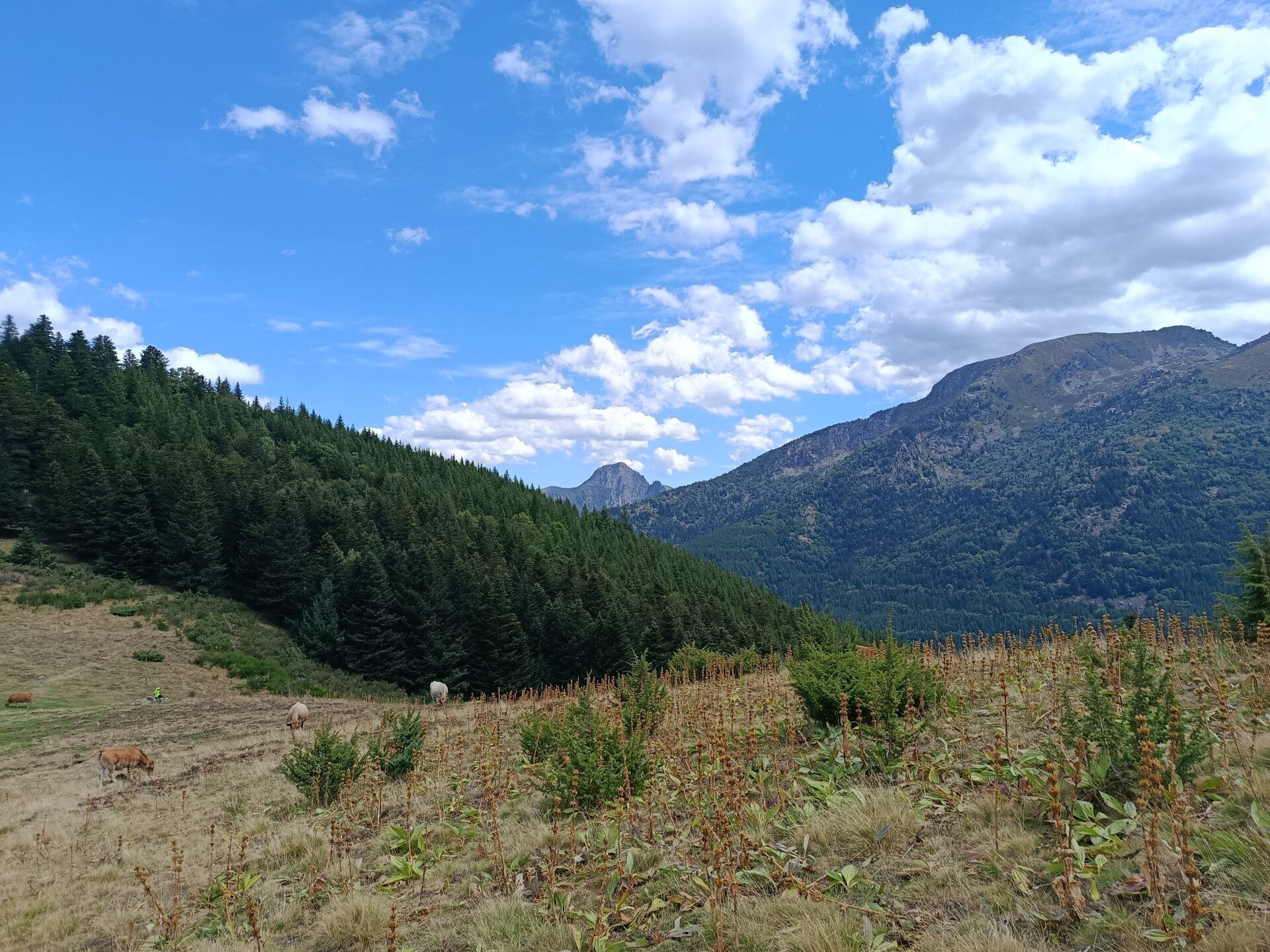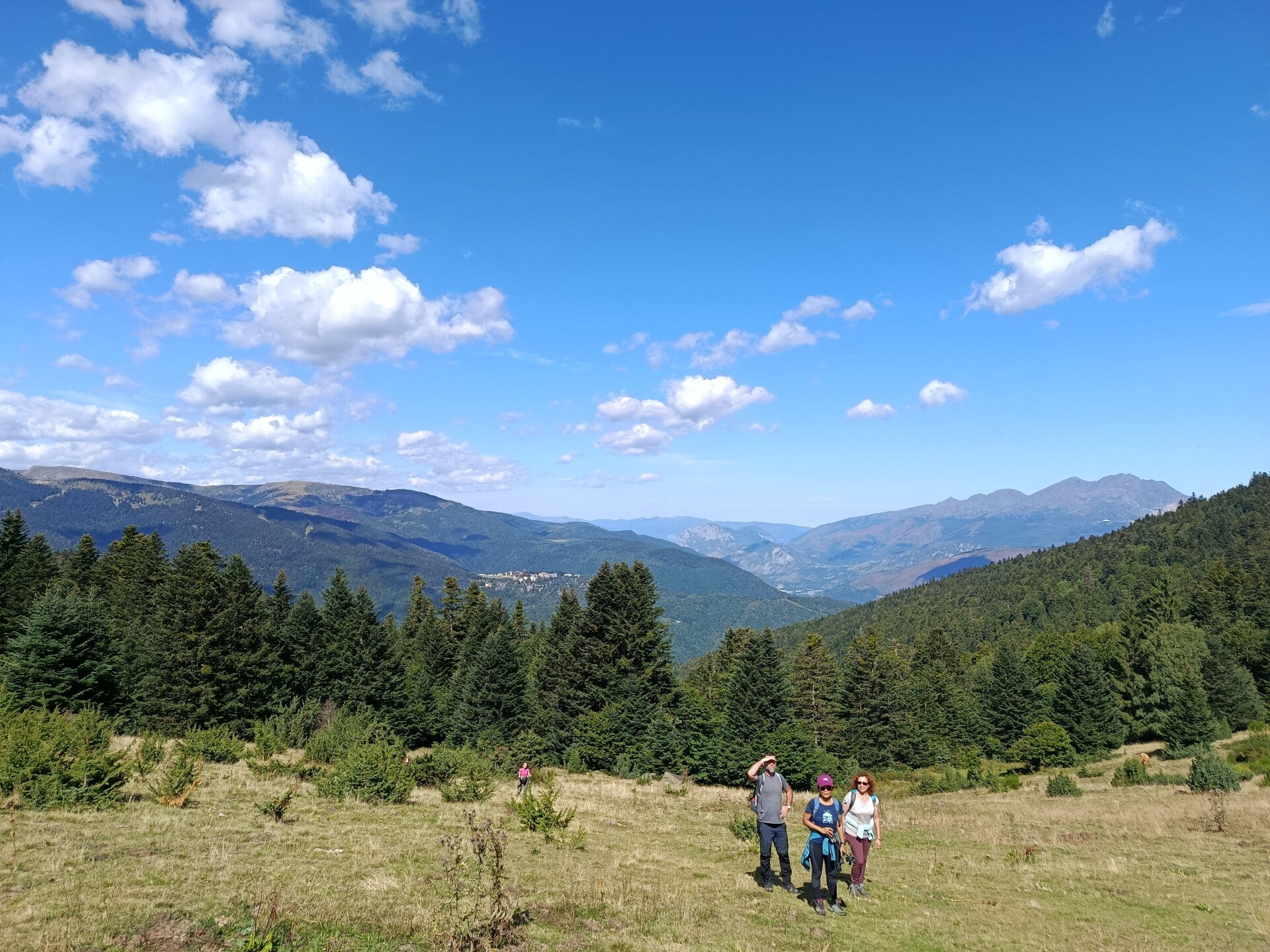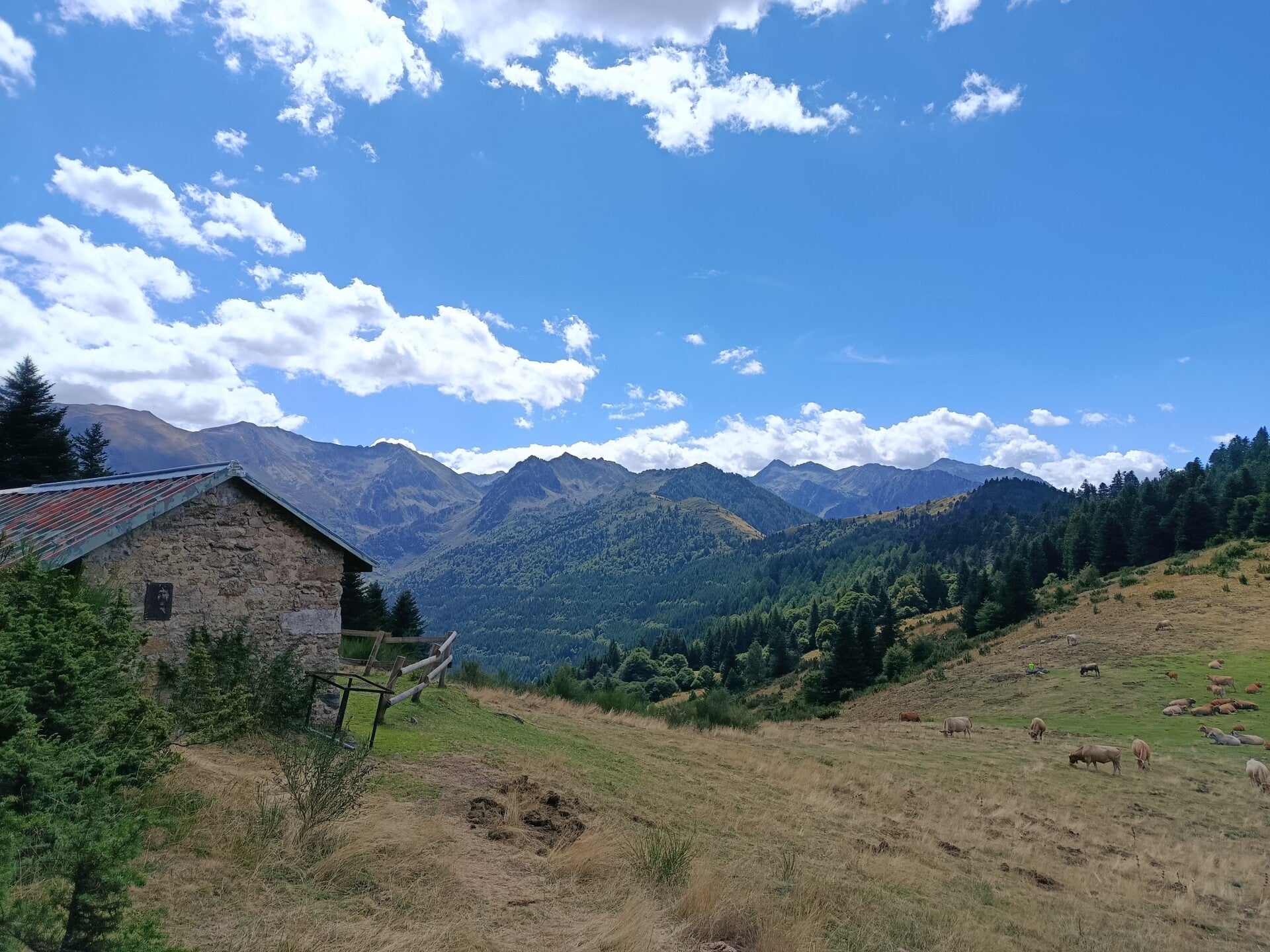 Balade sur quatre versants de montagne, une traversée d'un troupeau de vache, une superbe vue à chaque coin, vallée d'Orlu, vallée d'Ax, pas de pluie, une pause aux sources chaude pour les pieds (après 12 Km et plus de 700 D+) et finir au resto La Gare des Vals avec apéro et un super repas (désolé mais là pas de photos, trop occupé par la qualité du cadre, des propriétaires et du repas). Une heure d'avance sur l'horaire prévue, rando qui malgres tout, se fais bien.